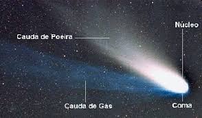 Cauda: estrutura alongada formada por gás ou poeira que fica localizada na parte posterior do cometa e com extensão variável que chega a milhões de quilômetros. A cauda de um cometa aponta sempre na direção oposta ao Sol.